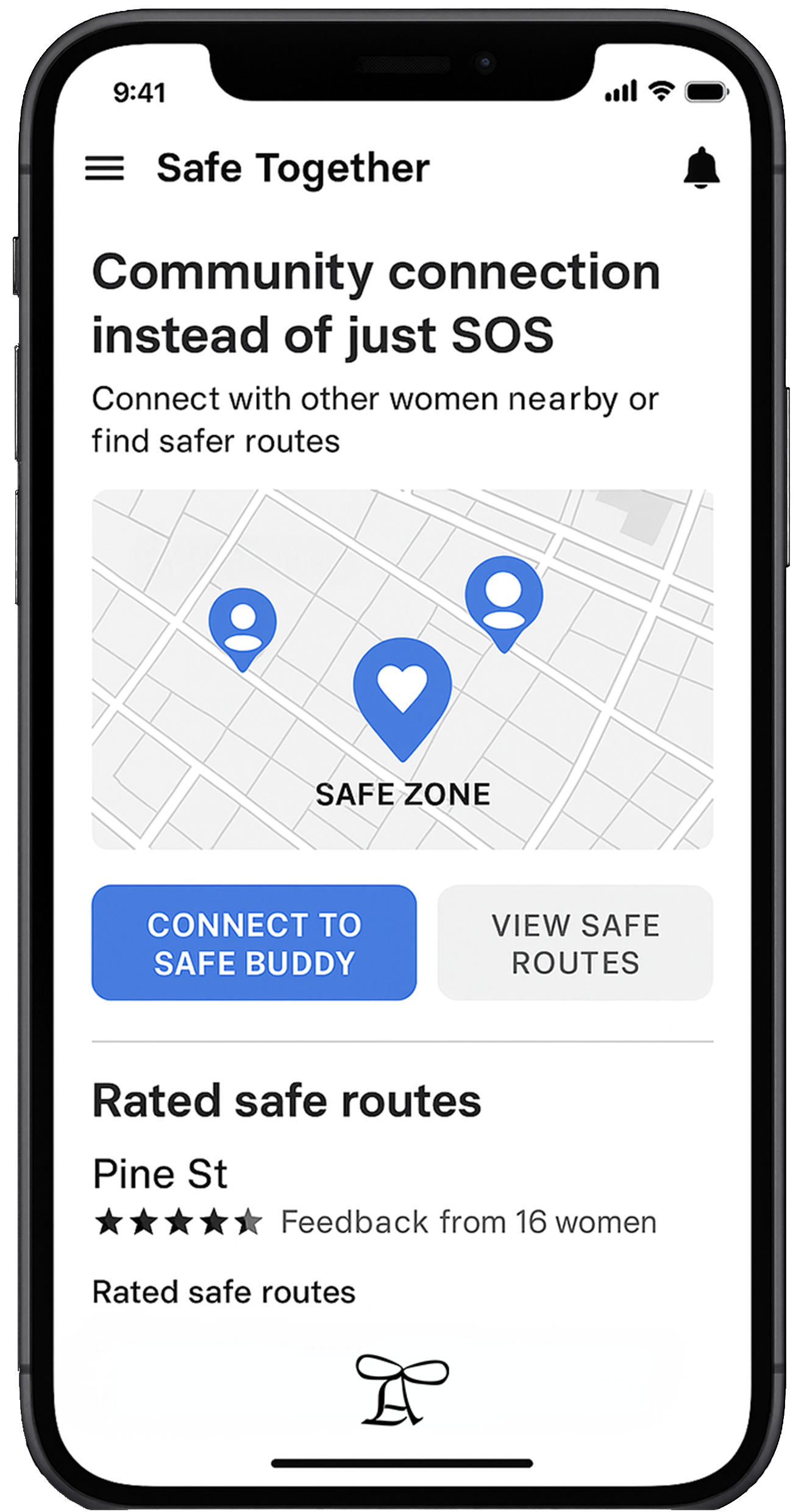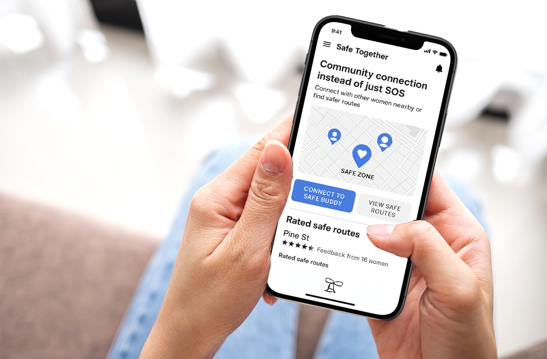 Die App verbindet Frauen im öffentlichen Raum zu einem unterstützenden Netzwerk. Sie zeigt „Safe Buddies“ und sichere Orte an, ermöglicht Begleitung und ist an die Nora-Notruf-App angebunden, durch die der Standort direkt an Polizei oder Rettungsdienste weitergeleitet wird.