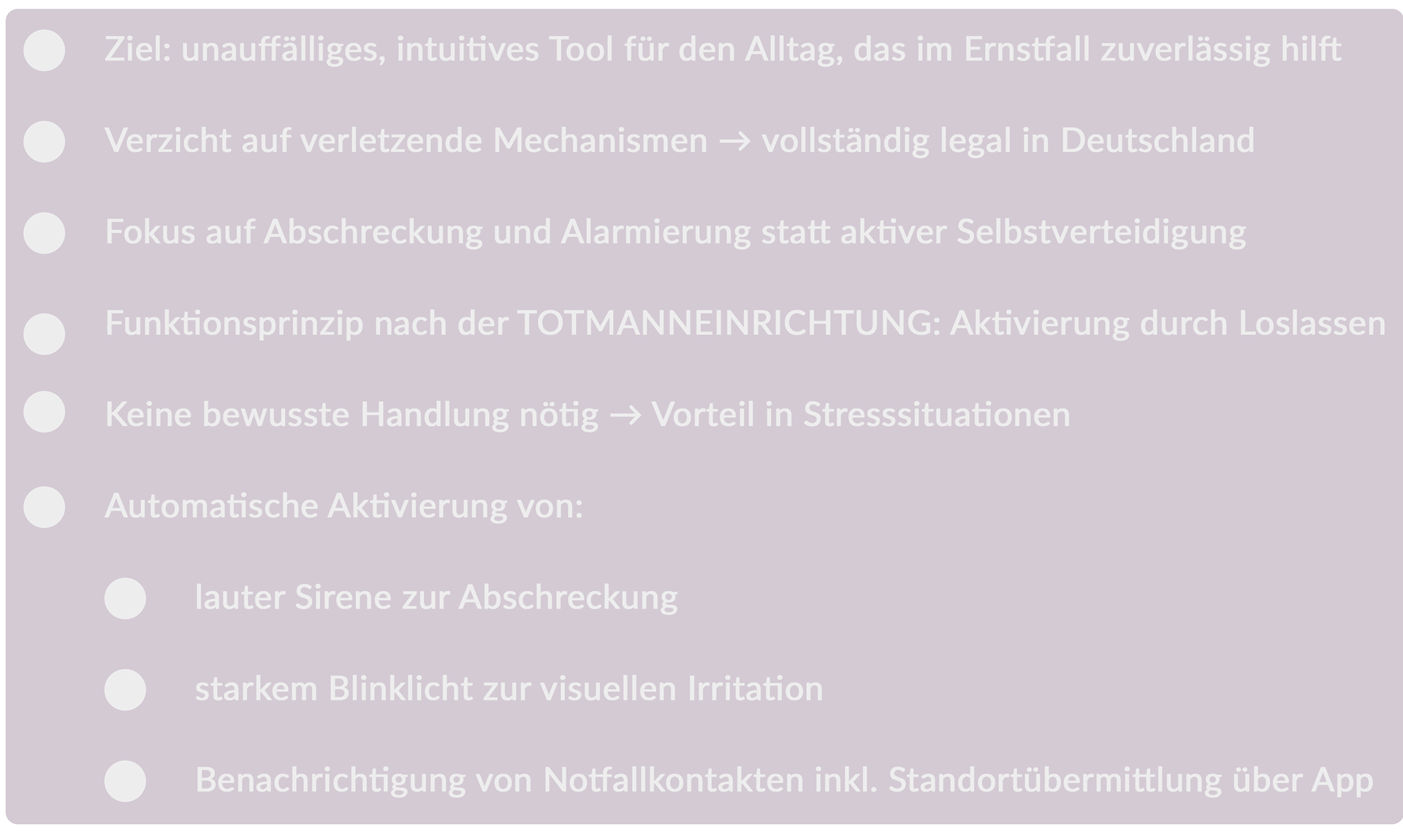 Das Bachelorprojekt untersucht, wie Unsicherheit im öffentlichen Raum konstruiert wird. Als gestalterische Antwort wurde ein Selbstverteidigungstool für Frauen entwickelt, welches vollständig legal in Deutschland einsetzbar ist.